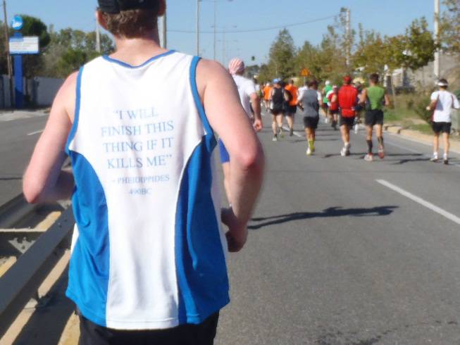Leoforos Marathonos 11.09 Uhr / Km 24,0 "I will finish this thing if it kills me". Dieses T-Shirt schreibt diesen Satz also Pheidippides zu. Nun gut. Mit einem ähnlichen Motto gehe ich Marathons ja auch an. Ich nehme mir vor, die Strecke nicht auf meinen eigenen Beinen zu verlassen, außer durchs Ziel. |