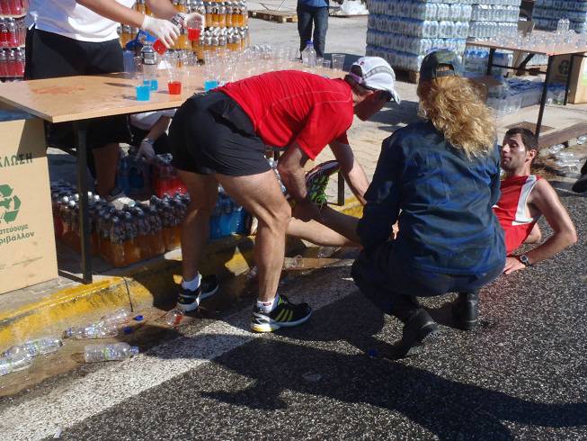 Leoforos Marathonos 11.23 Uhr / Km 26,5 Diese Sanitätsposten standen nun in immer kürzeren Abständen an der Strecke. Und sie waren gut besucht. Fast ausschließlich wurden dann die Beine und Knie mit (vermutlich) Kältespray eingesprüht und weiter ging es. Naja... für fast alle... |
