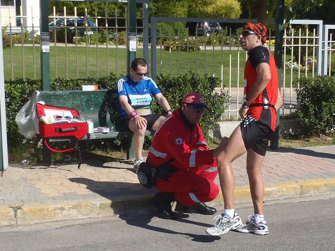 Leoforos Marathonos 11.16 Uhr / Km 25,0 Das Bild sah man oft entlang der Strecke. Läufer mit Krämpfen, oder zu Gehern mutierte Läufer, oder gar Aussteiger. Die Quote kam mir recht hoch vor für ein Marathon-Feld in der Ecke um die 3:45 Stunden. Und Nein, ich empfand keine Schadenfreude bei dem Gedanken, daß es sich wohl fast ausschließlich um Läufer handelte, die mich zuvor überholt hatten. |