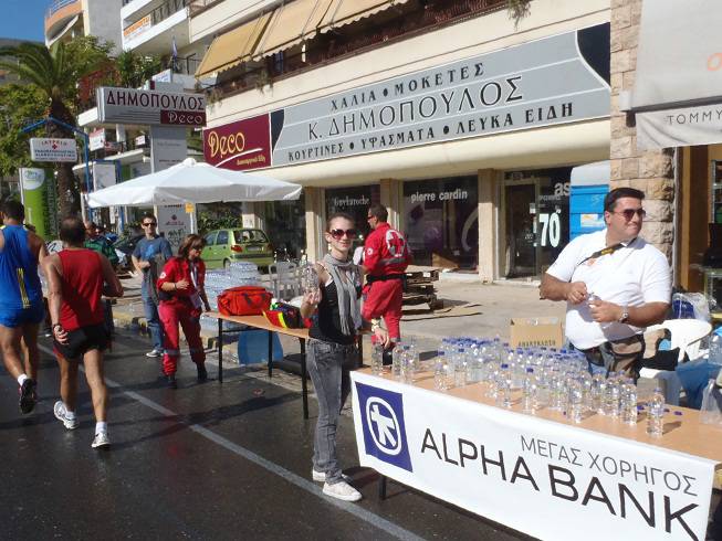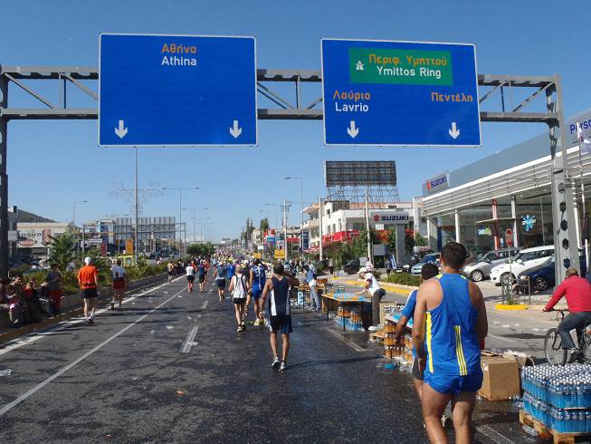 Leoforos Marathonos Pallini 11.30 Uhr / Km 27,5 Nächster Verpflegungsstand mit Wasserflaschen. Und ganz dezenter Werbung. Den höchsten Punkt der Strecke hatten wir passiert. Nun wurde es etwas leichter.