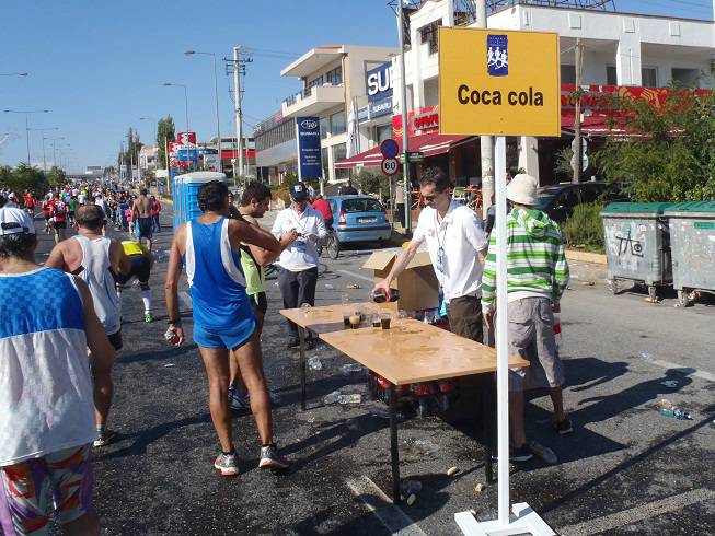 Leoforos Marathonos / Leoforos Sparton Gerakas 11.43 Uhr / Km 30,0 ... und stürzte mich dann am Ende auf die Coca-Cola. Und ja, die Griechen boten nicht einfach irgendeine Braun-Plürre an, sondern echte Coca-Cola!! |