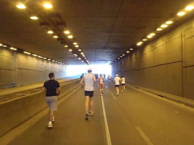 (642) Gerakas 11.48 Uhr / Km 30,5 Hier im Tunnel unter der Autobahn 642 endete die Leoforos Marathonos, die uns seit dem Start begleitet hatte. Der Marathon war allerdings noch längst nicht zu Ende. |