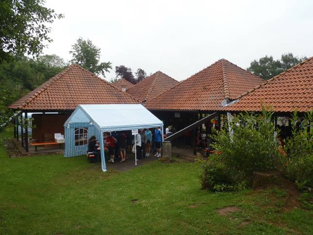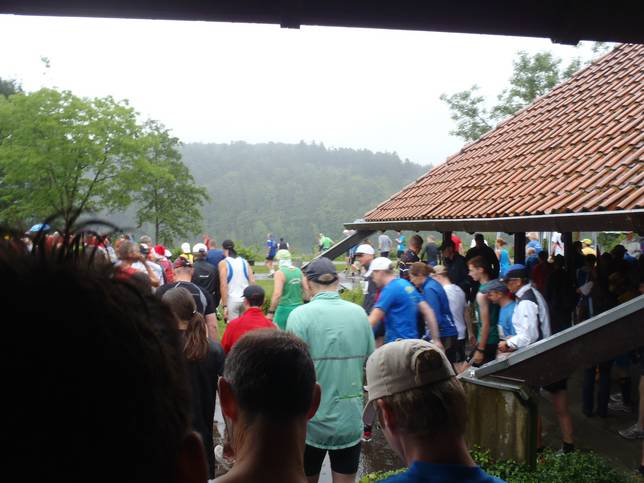 10.22 Uhr Twistesee Strandbad Na toll, statt wie angekündigt sonnig mit leichten Schauern gab es heftigen Dauerregen. Das fing gegen 8.30 Uhr an und hörte gar nicht wieder auf. Die Startunterlagenausgabe war unter dem blau-weißen Zelt, die Läufer versteckten sich alle unter den Dächern.