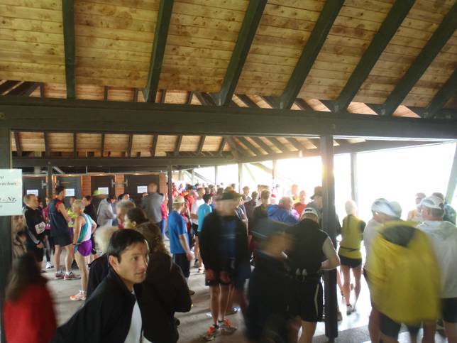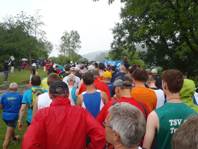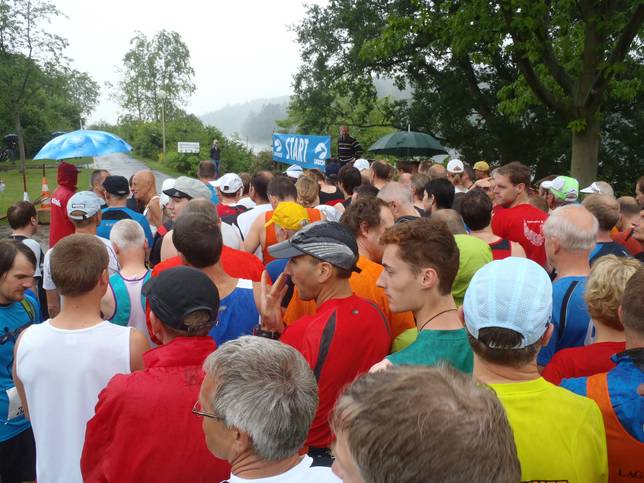10.58 Uhr Twistesee Strandbad Bis zu allerletzten Minuten wurde unter dem Dach ausgeharrt, ehe man sich dann von Organisator Heinrich Kuhaupt (seit der ersten Veranstaltung 1981 verantwortlich für den Lauf) in die Startaufstellung rufen ließ. |
