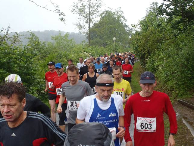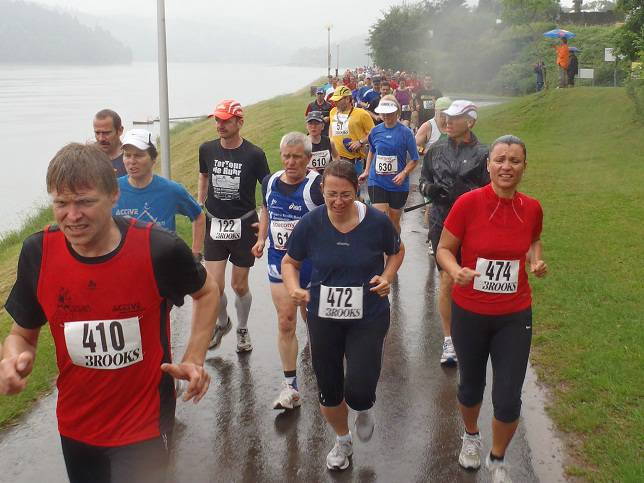 Twistesee 11.08 Uhr / Km 1,5 So richtig glücklich sehen diese Läufer nicht aus. Zur Orientierung: die BROOKS-Startnummern sind für den Marathon (die niedrigen Nummern) und den Halb-marathon. Die roten Saucony-Nummern sind die 10-Kilometer-Läufer. Die 5-Kilometer-Läufer starteten gesondert. |