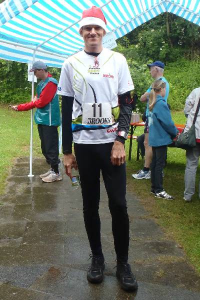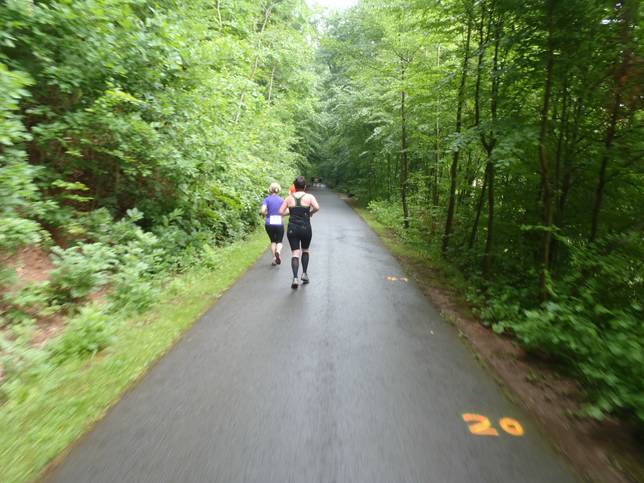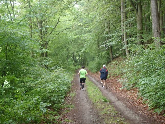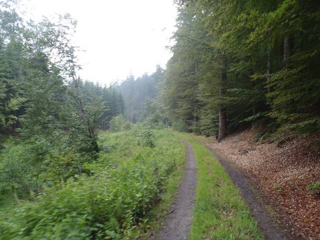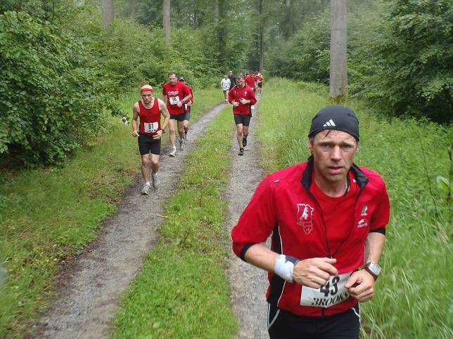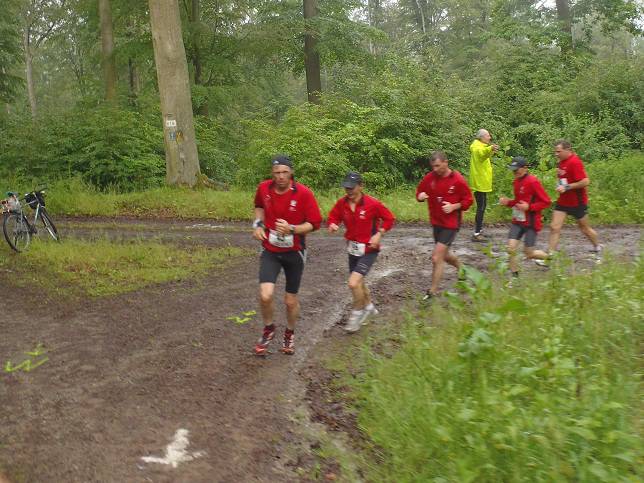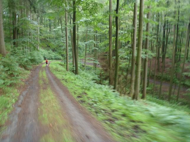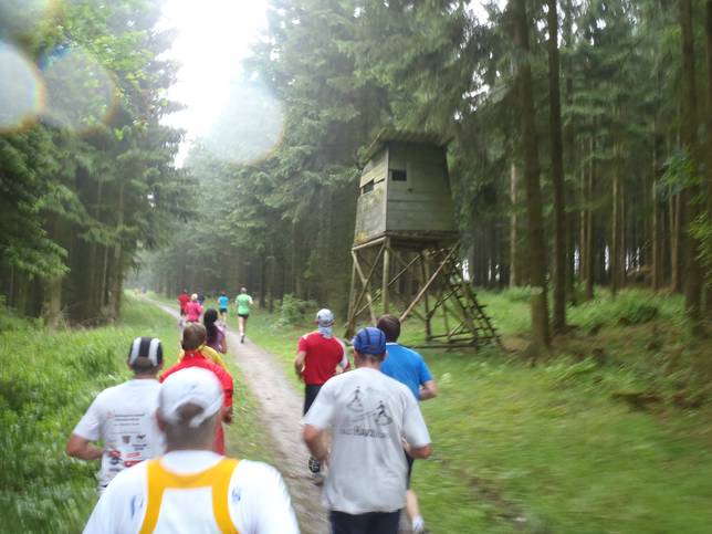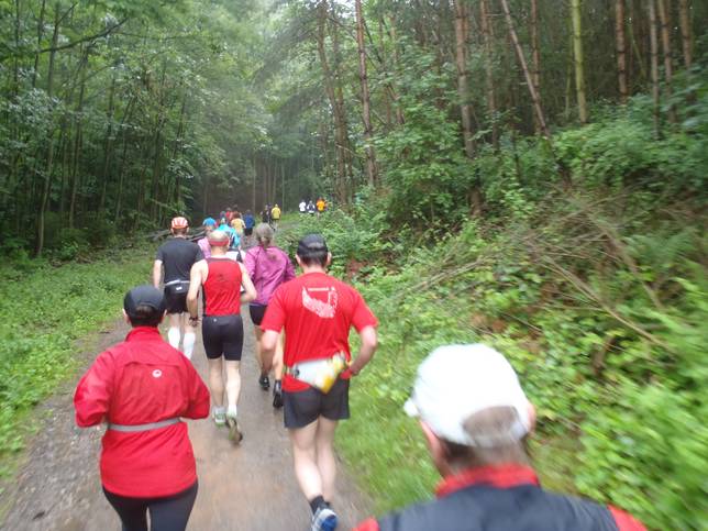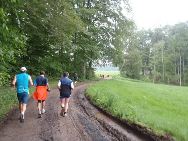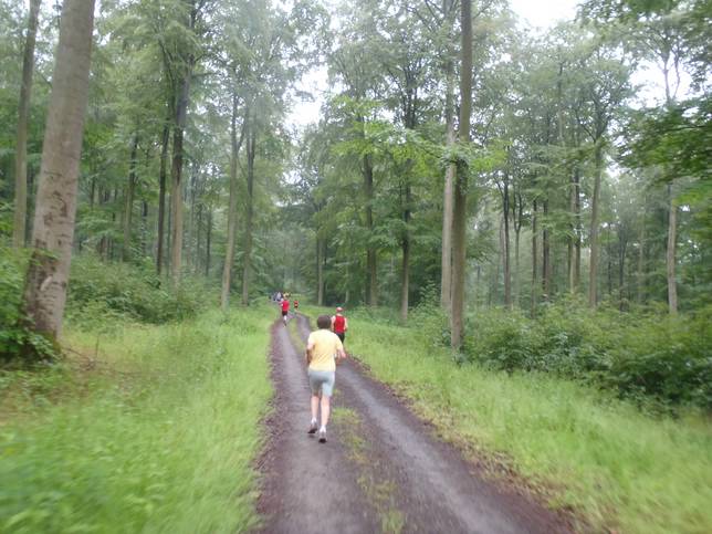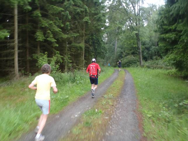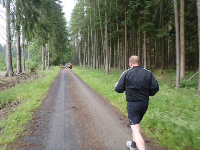 Wetterholz 11.30 Uhr / Km 5,0 Bald darauf ging es wieder in den Wald. Überhaupt führt 80% der Strecke auf guten Wald- und Forstwegen, davon ist man meist im Wald. Und auch trotz des Dauerregens war die Strecke sehr gut laufbar. |