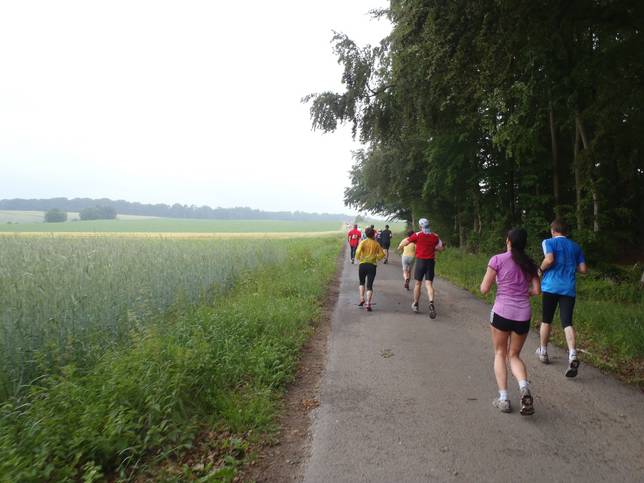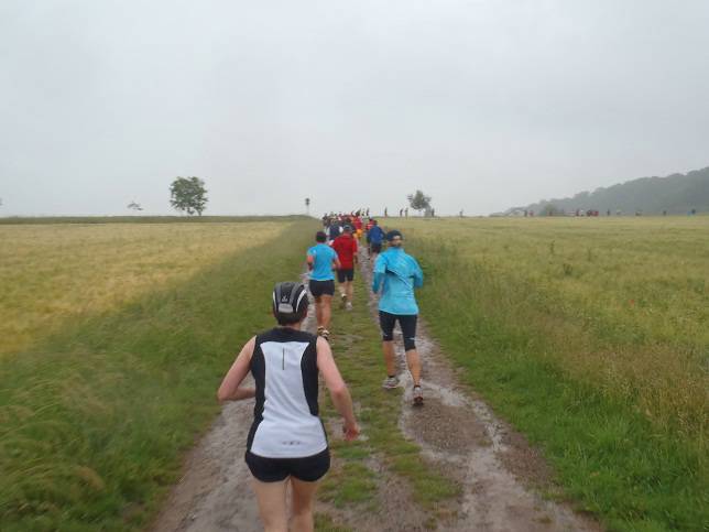 Neu-Berich 11.18 Uhr / Km 3,0 Hinter dem Wald kommt ein Stück freies Land. Hier spürte man den Regen um so mehr. |