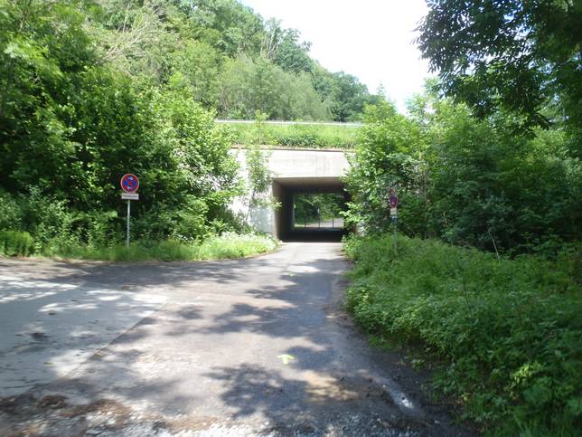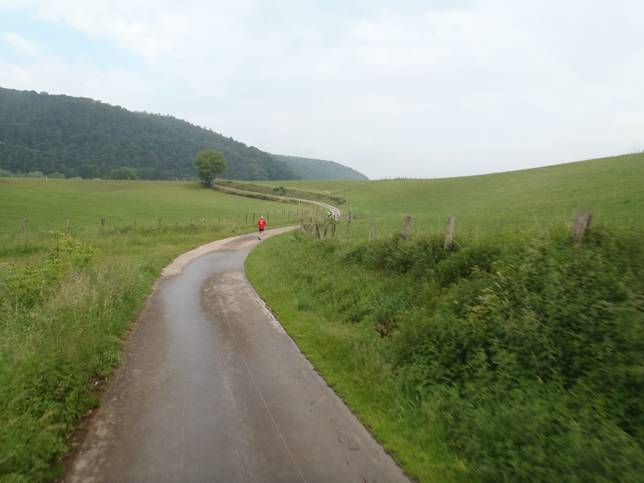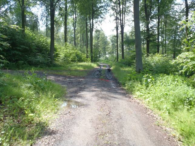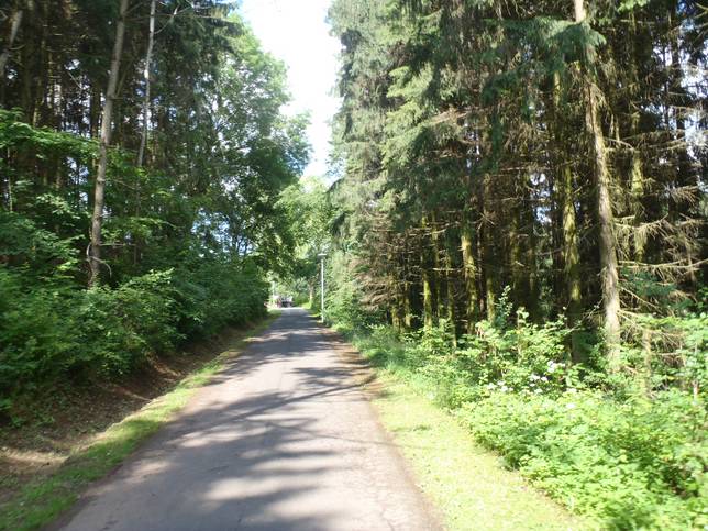 Braunsen 15.05 Uhr / Km 38,0 Die allerletzten Meter bergab. Ab der Kreuzung vorne ging es praktisch flach ins Ziel. Die Ankunft an der Kreuzung feierte ich wie einen Zieleinlauf. |