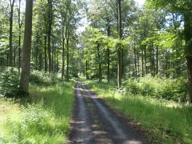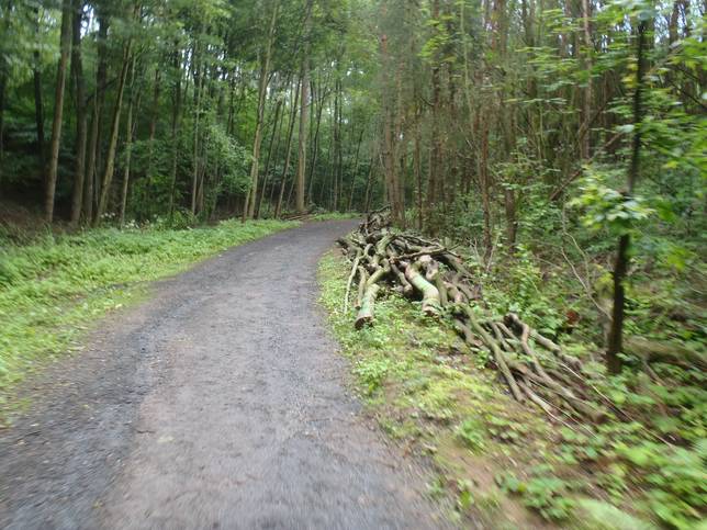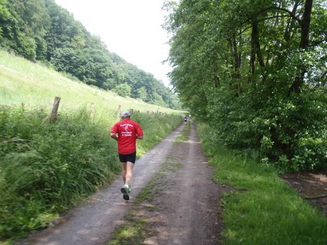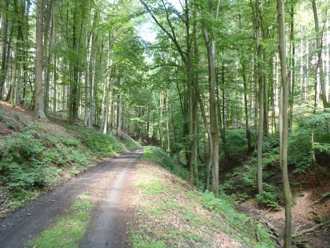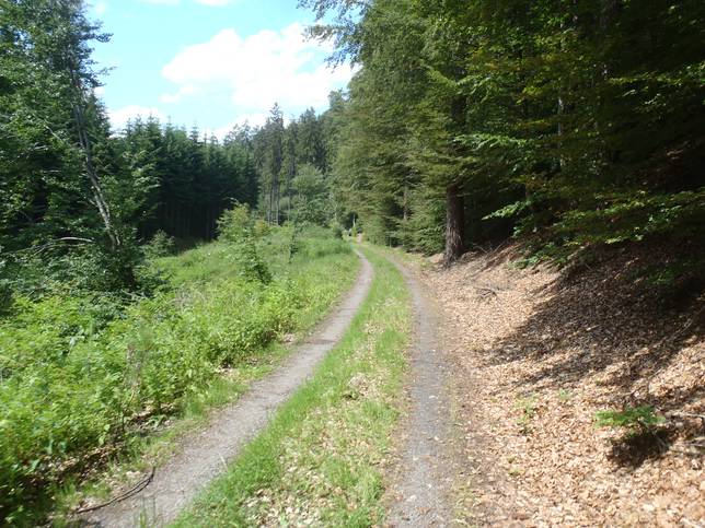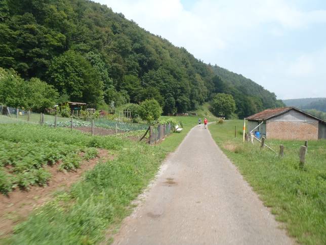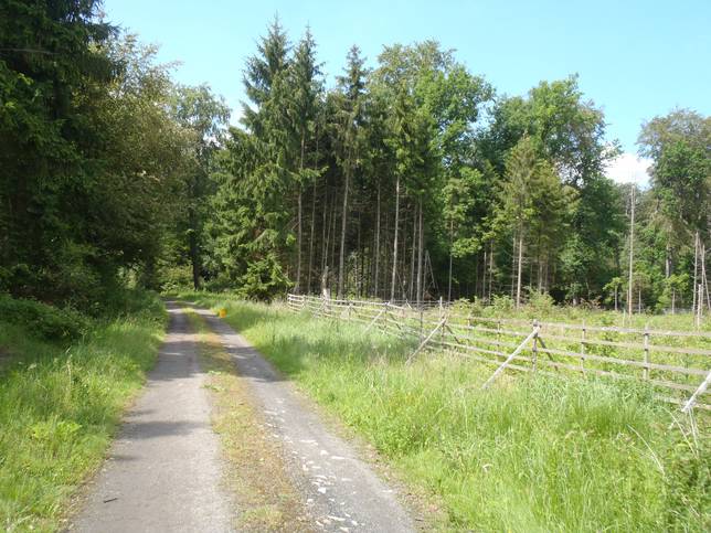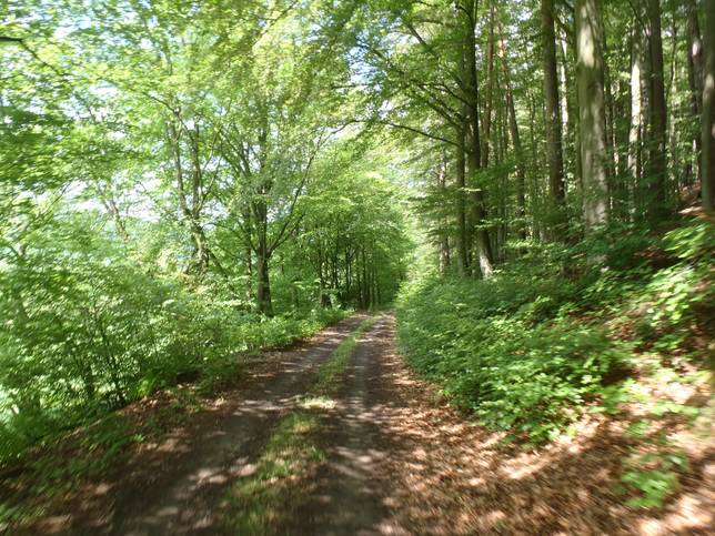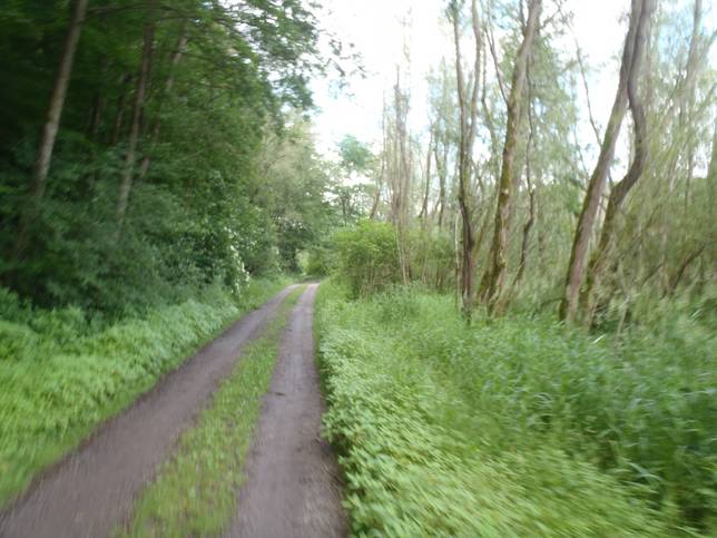 In den Erlen 12.41 Uhr / Km 16,5 Fast war der Weg bergab geschafft. Hinter dem Baum direkt voraus ging es noch einmal ein Stück bergab, das war es dann. |