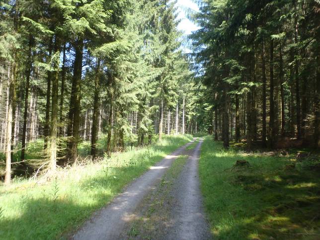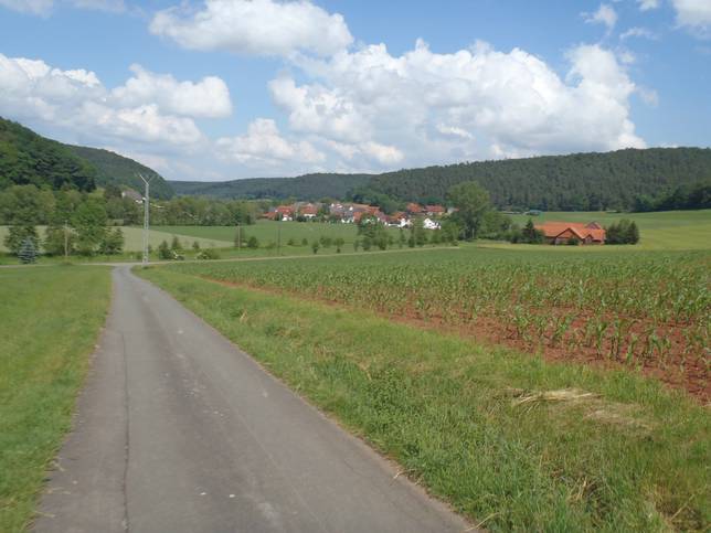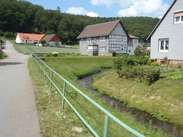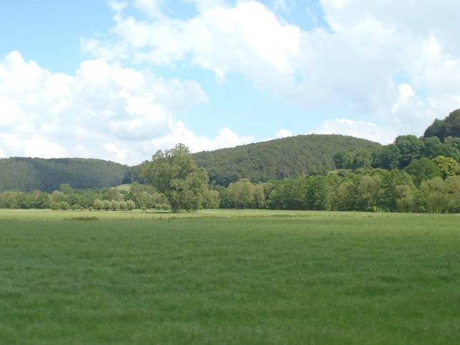 Braunser Hammer / Hammerseite 12.43 Uhr / Km 16,5 Wenn man denn dann mal den Blick vom Boden hob, gab es reichlich schöne Aussichten entlang der Strecke. Hier auf dem Stück Asphalt konnte man mal den Blick gefahrlos schweifen lassen. Ansonsten waren die Waldwege zwar nicht ernst-haft gefährlich, aber ein wenig Aufmerksamkeit schadete nicht. |
