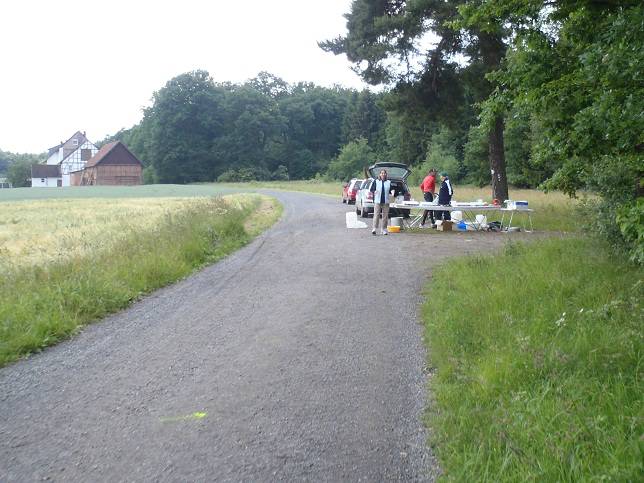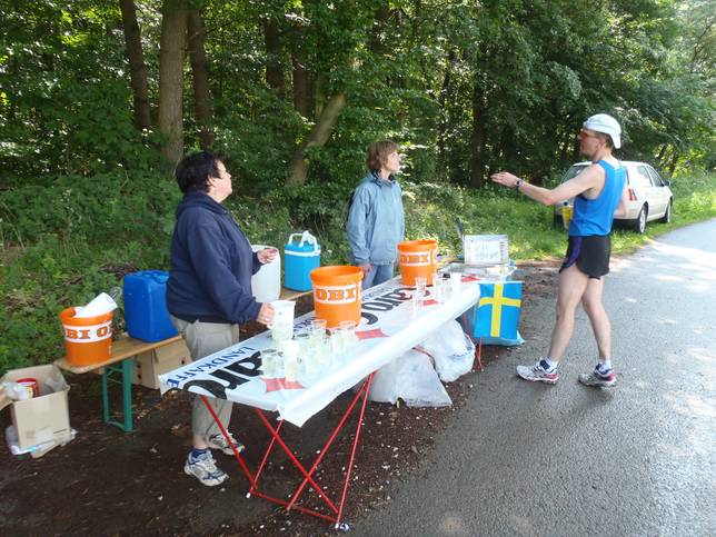 Alte Wildunger Straße 14.40 Uhr / Km 34,5 Fast 3:41 Stunden war ich nun schon auf der Strecke. Das merkte ich schon und da kam mir der Verpflegungs-stand gerade recht. An den windstillen Ecken des Kurses war es nun recht warm, da konnte man etwas zu trinken gut gebrauchen. |