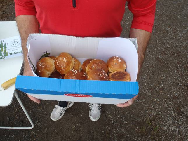Apenberg 14.09 Uhr / Km 30,0 Auf dem Schild steht zwar "VP 10+31", aber ganz so weit waren wir noch nicht. Auf der Strecke gab es fünf Verpflegungsstellen, den kurz hinter Start und Ziel aber nur auf Runde 2, also insgesamt neun auf der vollen Marathon-Strecke. Es gab überall Iso und Wasser, in der zweiten Runde dann auch Bananen. Bei dem Wetter reichte das völlig. Bei heißerem Wetter hätte man sich aber etwas einfallen lassen müssen. |