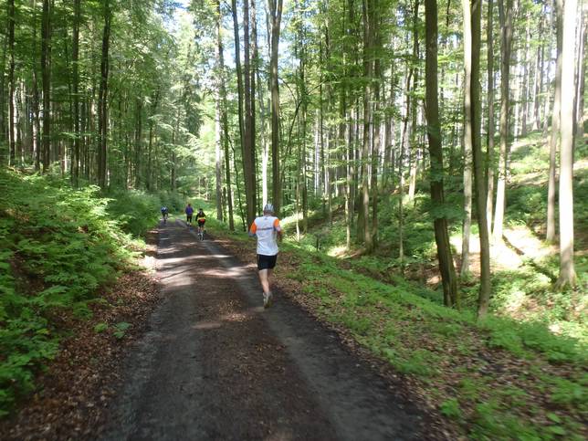 Wetterholz / Heidekreuz 13.41 Uhr / Km 26,0 Recht mühsam nahm ich jetzt Kilometer für Kilometer. Das Tempo lag bei 7:00 Min/Km. Und endlich kam die Sonne raus. Das brachte dann zwar auch einige sehr stickige Abschnitte mit sich, aber auch wunderschöne Blicke in den Wald. |