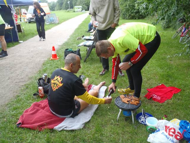 16.02 Uhr Zwischen den Läufen wurde gegrillt. Offenbar gelten die sonst üblichen Läufer-Verpflegungstipps nicht für Vielstarter. |