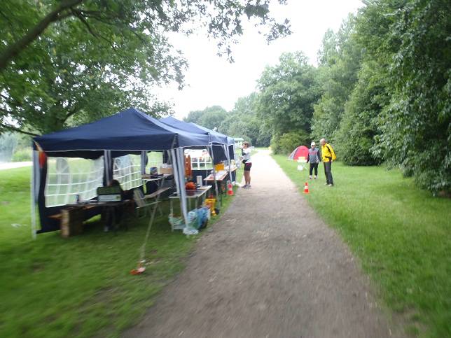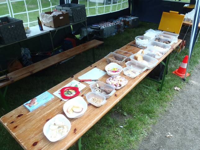 16.29 Uhr Überhaupt... lecker... der Verpflegungsstand war wie bei Läufen des 100 MC üblich eine wahre Pracht. Obst, Schokolade, Kekse, Süßigkeiten... es fehlte der Kuchen. Aber vielleicht war der auch nur schon aufgegessen. Zu trinken gab es (einen Tisch weiter) Wasser, Iso und Cola. Was will man noch mehr? |