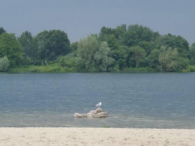16.31 Uhr Schön und idyllisch liegt er da, der Eichbaumsee. Und die Regenfront direkt dahinter. Der See ist leider der einzige Badesee, der wegen der schlechten Wasserwerte zum Baden gesperrt ist. Zumindest am Tag des Marathons war das so. |