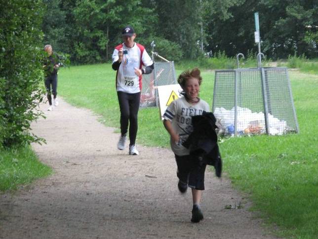17.30 Uhr / Kilometer 5,2 Runde 2 In Runde Drei hatte ich dann einen kleinen Läufer vor mir, der wunderschön mein Tempo ging, nachdem er gleich im Ziel die Jacke los war. Hinter dem Jungen komme ich (knapp in Führung liegend) und dahinter Sven Peemöller. |