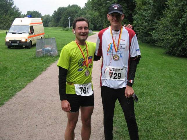 21.04 Uhr / Kilometer 42,4 Finish Johannes Brandl (links) und ich (rechts). Platz Drei holte sich Frank Berka (4:23:44 Std.), Sven Peemöller wurde Vierter (4:57:54 Std.) und gewann die Gesamtwertung aller drei Marathons haushoch mit 11:25:40 Stunden. Sensationelle Zeit! |