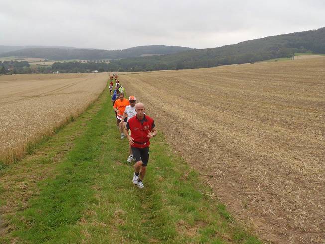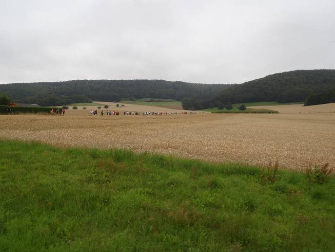 Auf der Schanze / Schlohweg 13.10 Uhr / Km 1,5 Kaum raus aus der Stadt ging es aufs Feld. Naja, man lief nicht direkt durch das Feld, aber fast... |