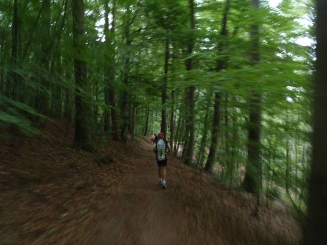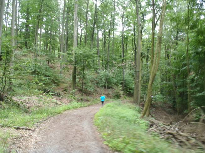 Unterer Burgseitenweg 13.37 Uhr / Km 6,0 31:16 Minuten für die ersten fünf Kilometer. Das war langsam. Aber wenn es fast nur bergauf geht. Nervig war die Dunkelheit im Wald. Bei 1/3-Sekunde Belichtungszeit kann man keine Fotos im Laufen machen. |