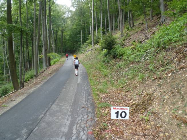 Philosophenweg 14.47 Uhr / Km 16,5 Rechts neben der Strecke gab es Schilder, auf denen die letzten 10 Km des Halbmarathons angezeigt wurden. Das hatte für den Marathons aber nichts zu sagen, da die Strecken ganz unterschiedlich waren. Beim Marathon waren immerhin bis Km 30 alle fünf Km und danach die letzten 10 Km je Km ein Schild. |