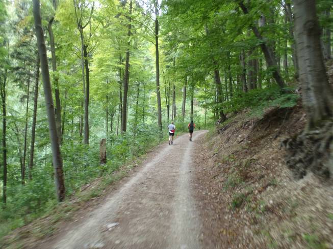 Fürstenweg 14.07 Uhr / Km 10,5 Immerhin war die Strecke selbst gut zu laufen. Es gab ein paar Passagen auf Asphalt, aber meist ging es auf guten Waldwegen dahin. Lediglich einige wenige Ecken waren durch Geröll ein wenig kniffelig, zumal es dort dann auch noch bergab ging. Aber in meinem "Tempo" war auch das kein Problem. |