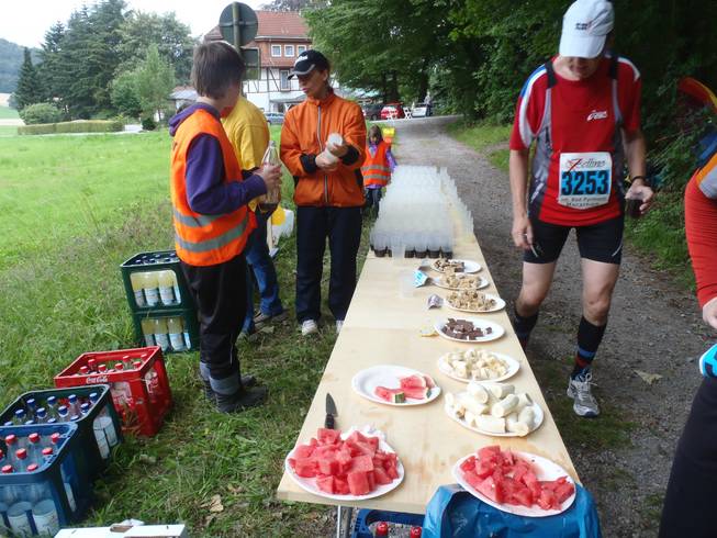 Landhaus Stukenbrock 14.47 Uhr / Km 16,0 Die Verpflegungsstände gab es alle 3 bis 4 Km. 12 insgesamt. Und sie waren sehr gut ausgestattet. Da konnte man schon mal ein wenig verweilen. Auch wenn das Loslaufen danach nur noch schwerer fiel. |