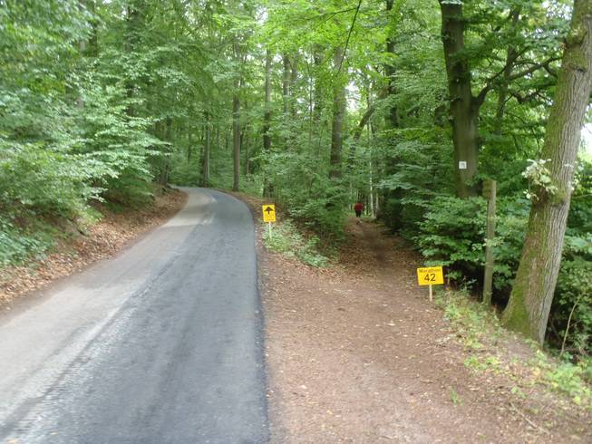 Bombergstraße 15.10 Uhr / Km 19,5 Hier wieder der vielen Abzweigungen, wo die verschiedenen Strecken verschiedene Wege liefen. Das klappt auch bei sehr eingeschränkter Konzen-trationsfähigkeit (wie bei mir den Tag) ganz gut. |