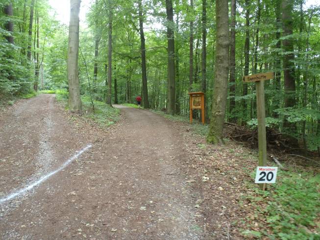 Philosophenweg 17.17 Uhr / Km 38,5 Die Ecke kam mir schon bekannt vor. Hin und wieder hatte ich solche Eingebungen. Half mir aber wenig bei der Orientierung. Und sicher konnte ich mir auch nicht sein. Wald sieht immer so gleich aus. |