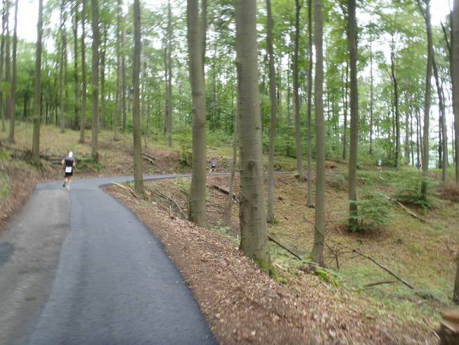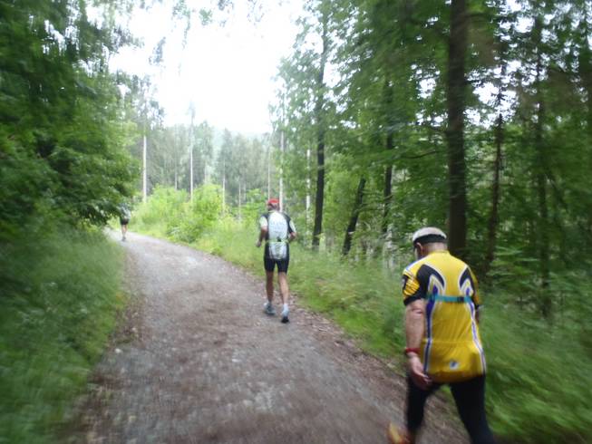Philosophenweg 13.27 Uhr / Km 4,5 Nach 2,5 Km erreichte man die Baumgrenze und von nun an ging es 37,5 Km nur noch durch den Wald. Die Orientierung hatte ich sowieso schon verloren. Wer Lust hat, kann sich ja mal den Plan auf der Veranstalter-Homepage anschauen. Noch verwirrender geht es kaum. Aber im Wald und auf der Strecke war alles sehr gut ausgeschildert. |