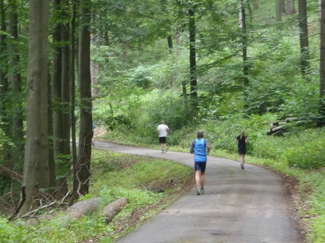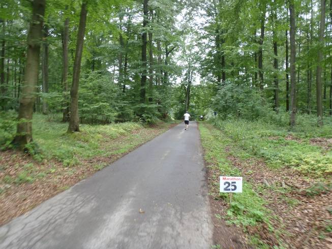 Pyrmonter Berg 16.08 Uhr / Km 27,5 Nun ging es ultimativ zum höchsten Punkt (350 Meter). Da gab es auch die einzig wirklich heikle Abzweigung, an der ich einem sehbehinderten Läufer vor mir noch auf den rechten Weg lotsen mußte. Aber wie schon gesagt: ansonsten waren die Ausschilderungen sehr gut. |