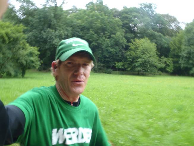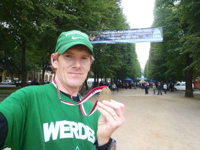Bergkurpark 17.29 Uhr / Km 40,5 So sehen Sieger aus. Also zumindest Sieger gegen sich selbst (auch wenn ich die Wut-Strategie lieber nie wiederholen möchte). Der tatsächliche Sieger Elias Sansar aus Detmold war nach 2:35:12 Stunden im Ziel. Auf diesem Kurs eine Wahnsinnszeit. |