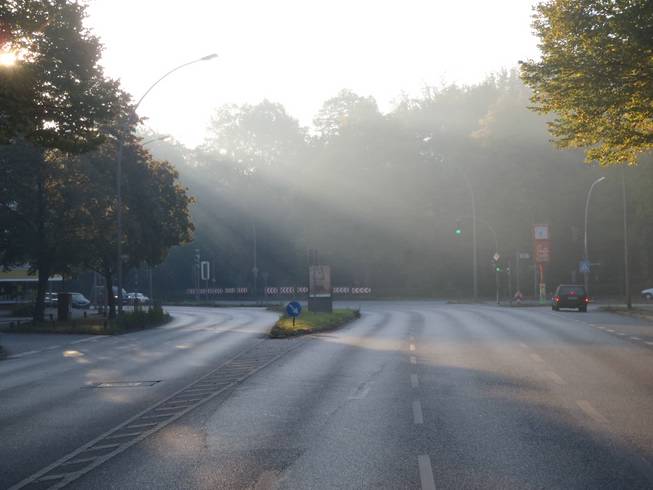 Hamburg-Alsterdorf, Braamkamp, 8.33 Uhr Morgensonne über dem Ring 2. Auf dem Rückweg vom Bäcker holte ich mir rasch die Startunterlagen ab. |