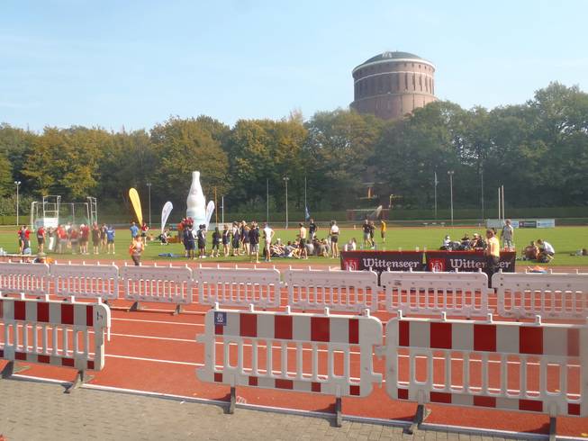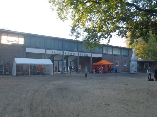 Jahnkampfbahn, Stadtpark, 9.40 Uhr Nach dem zweites (etwas kleinerem) Frühstück zu Hause und Umziehen kam ich zurück zum Stadtpark. So ein nahes zu Hause war hier ganz praktisch, bot der Veranstalter doch keine Kleiderabgabe. Nun wäre für den nicht so nah wohnenden Läufer ein Auto praktisch, aber vom Kommen per Auto wurde ausdrücklich abgeraten, zudem waren die Park-plätze vor dem Stadion ja gesperrt. Nicht wirklich nett. |