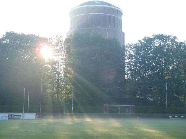 Jahnkampfbahn, Stadtpark, 8.42 Uhr Sonnenaufgang hinter dem Planetarium. Naja, der Sonnenaufgang war wohl schon zwei Stunden zuvor, sah aber trotzdem sehr schön aus. Und noch war es angenehm frisch. |