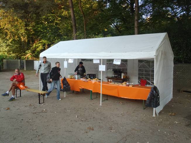 Jahnkampfbahn, Stadtpark, 8.39 Uhr 81 Minuten vor dem Start war noch nicht viel los. Links das Meldezelt, rechts ein kleiner Shop vom Laufwerk Hamburg (Ausrichter). Startunterlagen gab es nur gegen Unterschrift. Also den Erhalt einer Start-nummer mußte ich nicht einmal in New York quittieren. Aber wenn man es so will... |
