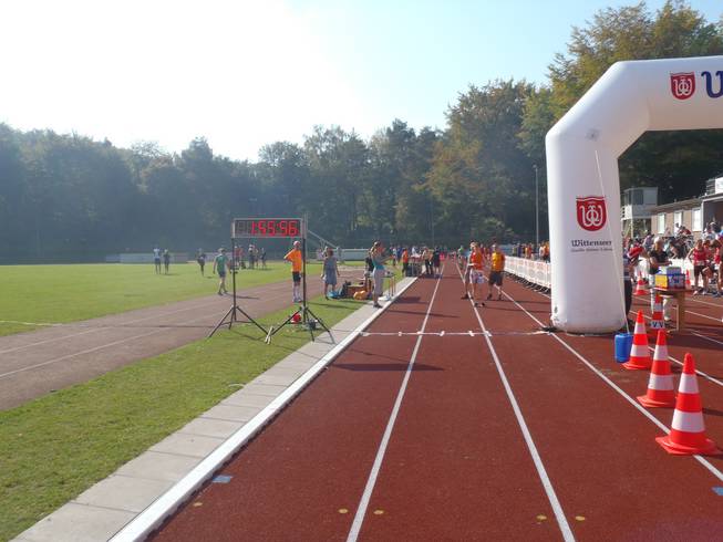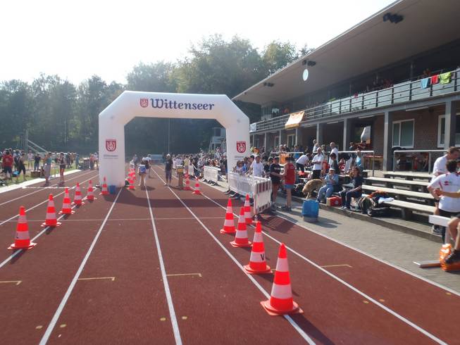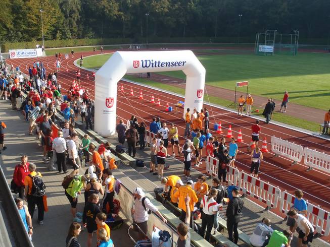 Jahnkampfbahn, Stadtpark, 14.10 Uhr Ich probierte die Auswahl an Getränken vom Sponsor Wittenseer Quelle zweimal durch, ehe sich das Durstgefühl verabschiedete. 27°C sind doch ein bisschen viel für einen Marathon. |