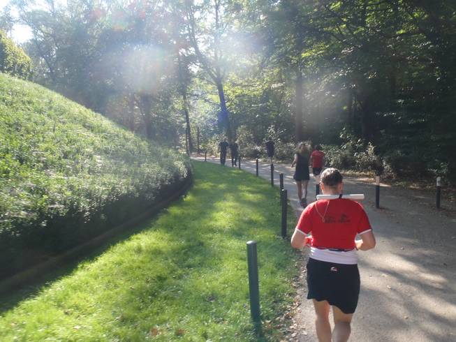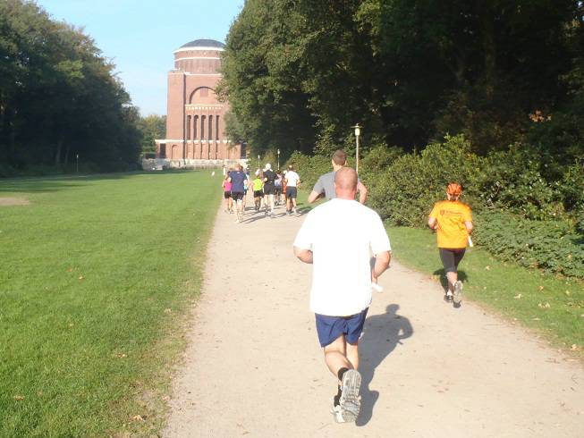 10.02 Uhr / Km 0,3 Runde 1 Hier dachte ich wirklich, ich wäre Letzter. Aber wenn man ganz genau auf das Bild schaut, dann sind ganz weit hinten noch drei Läufer von denen der ganz linke in meine Richtung läuft und vorne eine Start-nummer hat. Ich war also nur Vorletzter. |