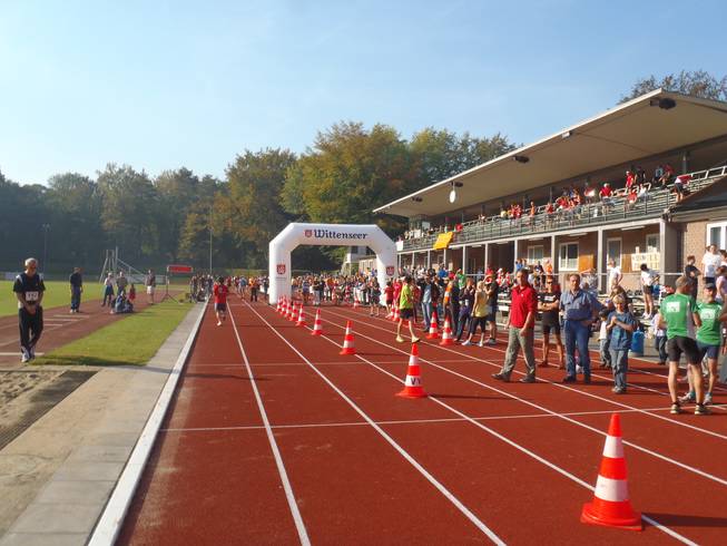 Jahnkampfbahn, Stadtpark, 9.59 Uhr Allmählich ging es in die Startaufstellung. 111 Läuferinnen und Läufer traten hier an. Davon aber nur 31 Marathon-Läufer. Außerdem traten 80 Staffeln (5x 8,4 Km) an. Dazu gesellte sich ein um 10.15 Uhr gestarteter Kinderlauf über 2 Km. |