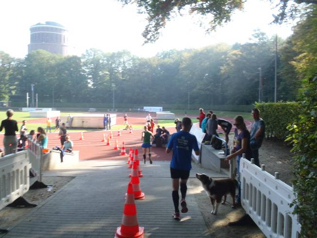 10.53 Uhr / Km 9,5 Runde 3 Zuschauer außerhalb der Jahnkampfbahn gab es so gut wie keine. Eigentlich gab es (von den Strecken-posten) einmal abgesehen drei Zuschauer, die vier Runden aushielten (die saßen gleich rechts um die Ecke) und die Frau links unten im Bild, die bis zum Ende uns Läufer immer wieder anfeuerte. |