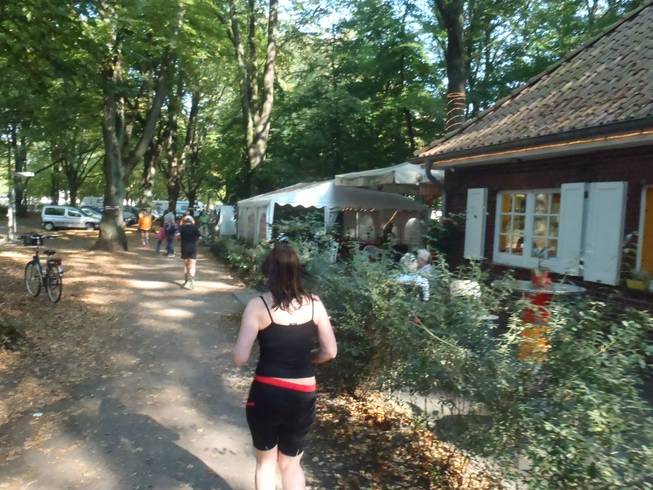 12.17 Uhr / Km 24,5 Runde 6 Kurz bevor es wieder auf die Jahnkampfbahn ging, lief man am Stadtpark-Café vorbei. Wäre man hier nicht schon relativ nahe am einzigen Ver-pflegungsstand des Laufes (stand bei Start und Ziel), ich hätte bestimmt mal angehalten. Bei dem Wetter waren 4,22 Km ohne Verpflegungsstand schon recht viel. In der Regel hatte ich nach 500 Metern wieder Durst. |