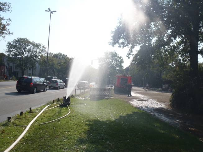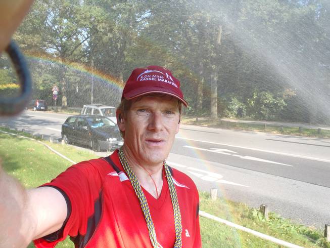 13.48 Uhr / Km 40,5 Runde 10 Die letzte Runde zog sich etwas dahin, ich verlor auch weiter an Tempo, sah aber keine Gefahr mehr, nicht unter vier Stunden zu bleiben. Also gönnte ich mir bei der Feuerwehr ein paar Meter nach diesem Foto eine etwas längere Dusche. Das gab noch ein Regenbogen-Foto, aber das hatten wir ja schon. |