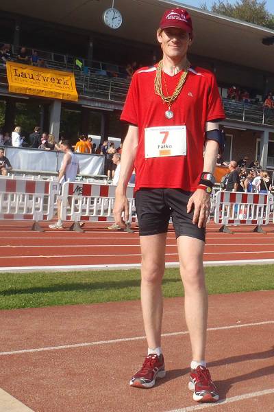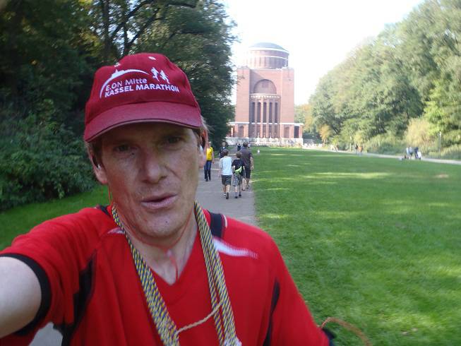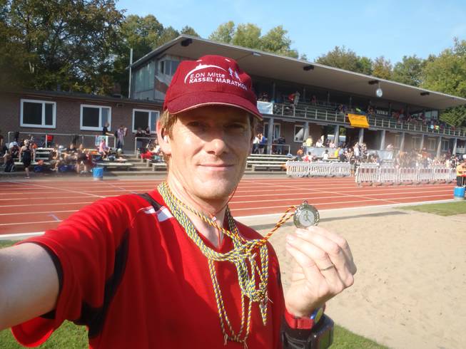Jahnkampfbahn, Stadtpark, 14.08 Uhr 41,78 Kilometer? Naja, das war ich auch schon gewohnt. Bad Pyrmont 42,1 Km, Cuxhaven 41,98 Km, Bad Arolsen 41,92 Km und Bremerhaven 41,8 Km. Zum Vergleich: Hamburg 42,44 Km, Mainz 42,36 Km. Es geht also schon. Den Chip tauschte man gegen das Finisher-Shirt ein. Die Kordeln durfte man behalten, wenn man wollte. Gezählt und/oder kontrolliert wurden sie nicht. Hrmpfff... |