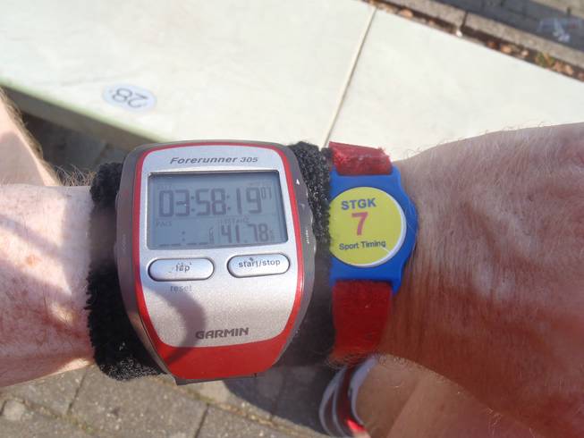 14.00 Uhr / Km 42,195 Finish ... und geschafft. 3:58:26 Stunden. Brutto. Meine Medaille (inzwischen die Nr. 65) hatte ich mir selbst mitbringen müssen. Seitens des Veranstalters gibt es keine. Da gab es nur Kordelbänder. |