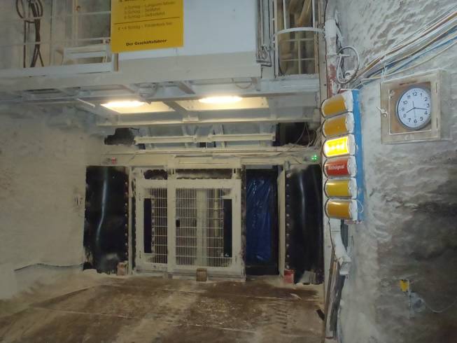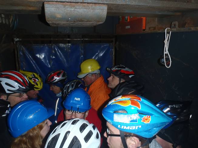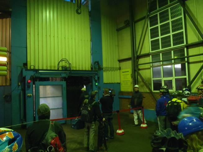 8.13 Uhr 16 Läufer finden gleichzeitig Platz im Fahrstuhl. Die Fahrt nach unten dauert vier Minuten. Im Fahrstuhl gibt es eine kleine Lampe (rechts am Band), sonst ist es dunkel. Außer man hat Blitz an der Kamera. Und auf der Fahrt nach unten wird es spürbar wärmer. |