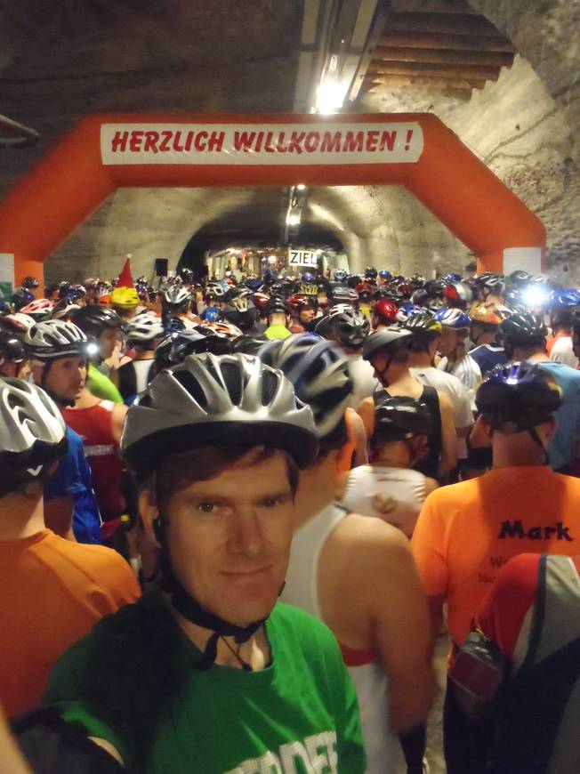 9.59 Uhr Hmmm... also von mir zum Start und zum Ziel sieht nicht wirklich weit aus. Ein Helm ist übrigens Pflicht bei diesem Lauf. Da gibt es keine Ausnahmen. Am Besten geeignet ist ein Fahrradhelm, schon wegen des geringen Gewichts. Für ganz Vergeßliche und für Begleiter liegen aber oben auch Helme aus. Nicht verpflichtend ist eine Stirnlampe oder sonstige Beleuchtung. Eine solche kann ich aber wärmstens empfehlen, sofern man nicht mit Eulen-Augen geboren wurde. |