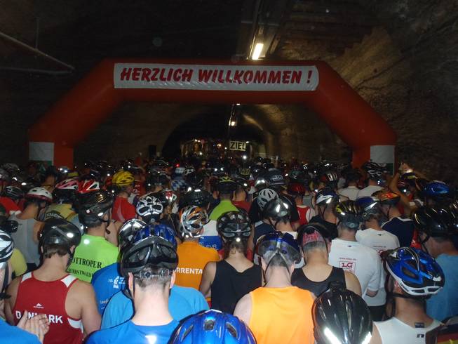 Runde Sechs 13.23 Uhr / Km 27 Warum wurden die Tunnel eigentlich nicht geradeaus gebohrt und mußten so rauf und runter gehen? Was für einen Sinn hatte das bloß? Der Weihnachtsmann? Halluzinationen?? Ich wünschte mir einen baldigen Zieleinlauf. |