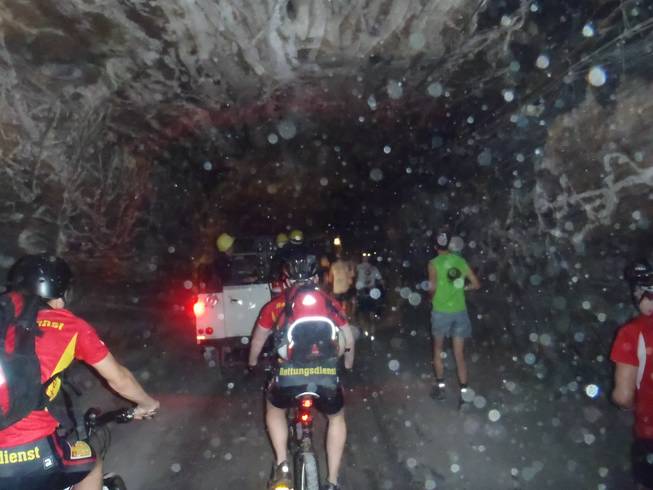 Runde Eins 10.36 Uhr / Km 5 Ganz schön viel Betrieb da unten. Vorne ein Wagen mit Fernsehkameras, dahinter zwei Sanitäter auf Bikes und dann noch die Läufer. Immerhin brachte der Wagen schön Licht in den dunklen Schacht. |