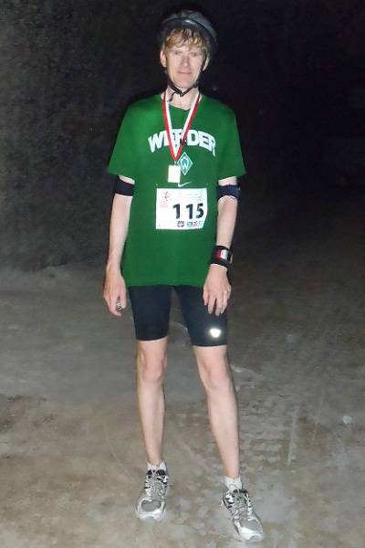 Runde Drei 11.54 Uhr / Km 15 Rechte Hand Fotoapparat, linke Hand Taschenlampe. Meine Stirnlampe wollte am Halm nicht halten, also hatte ich am Vortag noch schnell Licht gekauft. Sehr kluge Entscheidung. Und einmal lächeln für den Fotografen, auch wenn schon längst nicht mehr zum Lachen zumute war. Foto: |