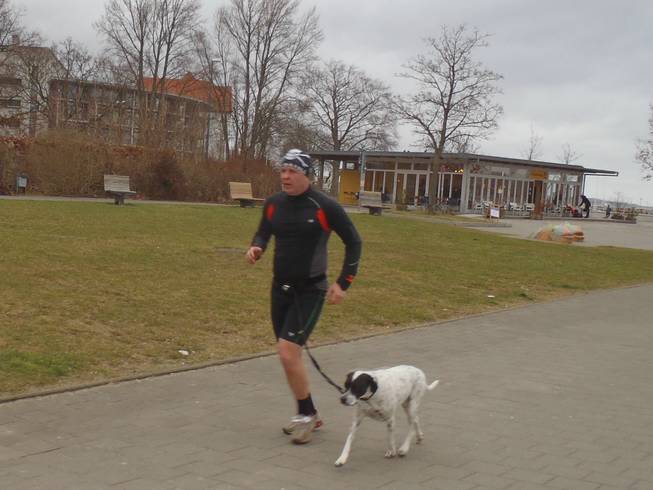 Kiellinie, Runde 4 13.22 Uhr / Kilometer 33,0 Laufen mit Hund. Ich bin nun nicht der große Hunde-Fan, aber wenn er so nett am Bein des ANDEREN Läufers bleibt... Und ja, er lief den ganzen Marathon durch. |